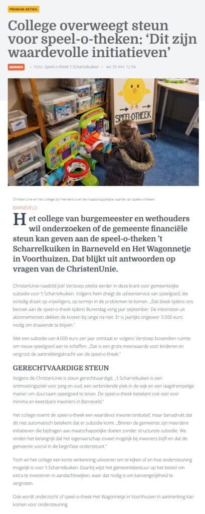 Deze maand stond er een mooi artikel over speel-o-theek ’t Scharrelkuiken in de Barneveldse krant! Heeft u het ook gelezen?!